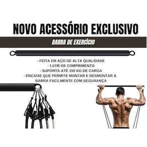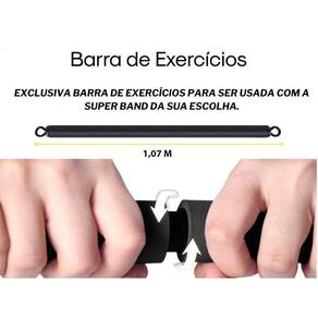 Barra de Exercícios Barra de Exercício Bravus Não acompanha Gancho para conectar com a Super Band Você pediu e a Bravus atendeu Apresentamos a Barra de Exercício Bravus sendo vendida separadamente A Barra de exercícios Bravus é feita em aço de alta qualidade, tem 1,07m de comprimento total e suporta até 150 Kg de carga. Sua Barra de Exercício Bravus tem um encaixe que permite que ela seja conectada ou desconectada facilmente. Conecte 1 ou até 7 elásticos extensores do seu Kit Tubing Bravus nas extremidades da sua Barra e aumente o número de exercícios que podem ser executados com seu equipamento. Treine com inúmeras combinações de carga e mantenha seu treino em evolução. Você pode começar com uma carga menor e ir avançando progressivamente. As cargas geradas pelos elásticos, dependendo do modelo podem variar entre 4,5 Kg até 95 Kg e você ainda tem a possibilidade de treinar com a Barra de Exercício Bravus , as alças de mão ou de tornozelo e ainda optar em usar a âncora de porta, tornando seu treino muito mais completo A Barra de Exercícios também pode ser utilizada com as Super Bands se você já possuir o Gancho presente no Mega Kit ou no Kit Super Bravus para conectar na Barra.