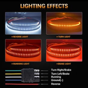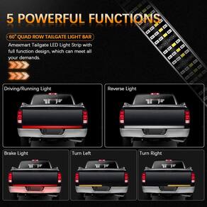 Especificação: ?Tipo: barra de luz para porta traseira ? Comprimento: 152 cm ? Fonte de luz: LED ?Tensão: 12-24V DC ? Taxa de impermeabilidade: IP68 ?Temperatura de funcionamento: -40+85°C ?Vida útil: mais de 50.000 horas ?Incluído no pacote: 1 peça * barra de luz LED para porta traseira de 152 cm - ?Design multifuncional? A barra de luz da porta traseira da Amexmart vem com luz vermelha, luz de freio vermelha, luz reversa branca, luz de seta âmbar esquerda/direita. Quando você liga as luzes de direção esquerda e direita, ao mesmo tempo, produzem uma função de flash duplo, este é um efeito normal. - ?Excelente brilho?A barra de luz de porta traseira de caminhão quad-Row de 152 cm adota 648 chips de LED de alta qualidade, o que torna a saída de lúmen 500% mais brilhante do que a faixa de luz normal da porta traseira e garante que seus caminhões/carros possam ser vistos mesmo no trânsito mais intenso do dia ou da noite. - ?Material premium?A faixa de luz de LED de quatro fileiras é feita de silicone IP68 à prova d'água de alta qualidade e materiais duráveis resistentes à ferrugem para ajudar a suportar todas as condições climáticas. Estas barras de luz de porta traseira de 152 cm são super duráveis com uma vida útil de mais de 50.000 horas. - ?Fácil instalação?Nossa barra de luz LED para porta traseira tem plugue plano padrão de 4 pinos e fita autoadesiva. Sem necessidade de perfuração, instalação adesiva Plug and Play. - ?Ampla aplicação?Estas tiras de luz LED para porta traseira de caminhão operam em 12 V CC e 152 cm de comprimento, compatíveis com Dodge Ram 1500 2500, 3500, 4500, Ford F150, F250, Chevy, Silverado, GMC, Sierra e a maioria dos caminhões, picapes, veículos de reboque, carros, SUV, trailers, etc. Nossa faixa de luz para porta traseira também é um presente bonito e prático de peças automotivas para seu pai/marido/irmão/filho/amigo. - ?Nota especial!! ?Se você conectar uma barra de luz de porta traseira de 4 pinos a um conector de 7 pinos usando um adaptador de 7 pinos para 4 pinos, nossa barra de luz de porta traseira de 152 cm pode não funcionar corretamente. Para evitar isso, você precisa comprar um "adaptador de reboque de 7 pinos para 4 pinos" ou "chicote de reboque de 7 pinos para 4 pinos com fio reverso de 12 V".