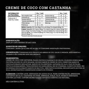 Blend proteico caseinato de cálcio, colágeno hidrolisado, proteína de soro do leite isolada , recheio sabor de creme de coco, cobertura sabor de chocolate branco sem açúcar, xarope de polidextrose, castanha-de-caju, óleo de palma, fruto-oligossacarídeo, triglicerídeos de cadeia média, mix de vitaminas ácido ascórbico, nicotinamida, acetato de DL-alfatocoferila, D-pantotenato de cálcio, cloridrato de piridoxina, riboflavina, tiamina mononitrato, palmitato de retinila, ácido N-pteroil-L-glutâmico, D-biotina, colecalciferol e cianocobalamina , cloreto de sódio, mix de minerais sulfato de manganês, sulfato de cobre e picolinato de cromo , edulcorante xarope de maltitol, umectante glicerina, emulsificante lecitina de soja, aromatizantes e conservador sorbato de potássio.