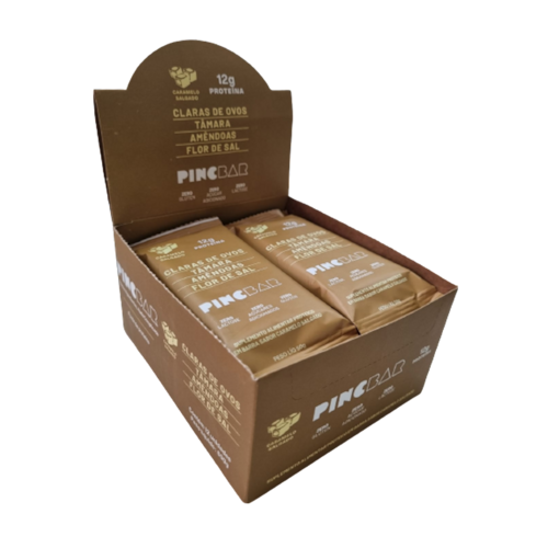 A Barra de Proteína Caramelo Salgado Sem Açúcar 50g Pincbar 12 Unidades é adoçada com tâmaras e uva branca. Não contém lácteos e conservantes artificiais.