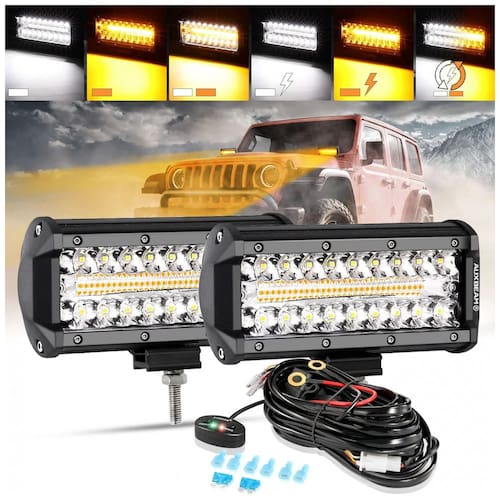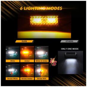 ATUALIZAR 6 MODOS DE ILUMINAÇÃO A barra de luz de 17 centímetros do feixe auxiliar com kit de chicote de fiação personalizado é muito adequada para luzes off road, luzes de advertência, faróis de nevoeiro, luzes de condução ou luzes de trabalho. Você pode alternar entre 6 modos de direção através do nosso controle remoto luz de direção branca, luz de neblina âmbar, luz combinada branca e âmbar, luz intermitente branca, luz intermitente âmbar, luzes estroboscópicas branca e âmbar.