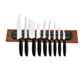 º Possui imãs que seguram objetos metálicos, deixando as facas e ferramentas expostos na parede de maneira organizada e fácil de usar.