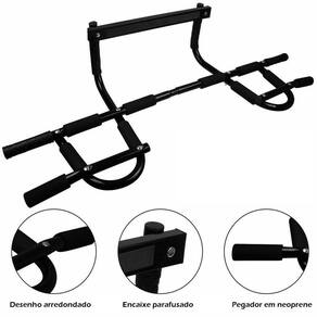 Marca: Lorben Cor: Preto Material: Aço com proteção de tinta epóxi e pegadores em neoprene Acabamento: Tinta epóxi Suporta até: 130 kg Requisitos do local de instalação: É necessário que a porta tenha batente para encaixar a parte superior da barra. A largura da porta deve ter entre 60 a 80cm e o marco da porta (profundidade) até 18cm