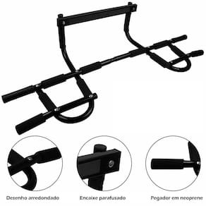 A Barra Multifuncional permite uma variedade de exercícios possibilitando trabalhar diversas áreas do corpo, como costas, abdômen, bíceps e tríceps. Proporciona o trabalho intenso de todos os músculos superiores e centrais. Ótimo para desenvolver músculos e resistência física sem sair de casa. E muito fácil de usar: basta montar o aparelho e encaixá-lo em um batente de porta com largura padrão (largura da porta entre 60 a 80 cm e largura do marco até 18cm) ou no chão, como apoio em abdominais e outros exercícios.Sua estrutura é em aço com protetores em neoprene, material resistente que suporta até 130 kg e evita calosidades nas mãos. Facilita a execução de seus treinos Você determina o tempo, a intensidade e o melhor local para seu treinamento Prática e de fácil instalação Não necessita furar sua parede ou porta Simples de desmontar Fácil de guardar Não acompanha tipoiasMarca: LorbenCor: PretoMaterial: Aço com proteção de tinta epóxi e pegadores em neopreneAcabamento: Tinta epóxiSuporta até: 130 kgRequisitos do local de instalação: É necessário que a porta tenha batente para encaixar a parte superior da barra. A largura da porta deve ter entre 60 a 80cm e o marco da porta (profundidade) até 18cmInclui:1 Barra fixa1 Kit para montagem1 ManualTamanho do produto: aproximadamente 108x45x27cmDiâmetro da barra: 2,5cmPeso: 3,290kgTamanho da embalagem: 56x23x8cmPeso da embalagem: 3,870kgCódigo do produto: 368Imagens ilustrativas. As tonalidades podem variar.