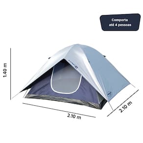 Próprio para 4 pessoas, ela possui local para pendurar lanterna na parte de dentro da barraca e conta com mosquiteiro na porta, teto e na janela traseira.