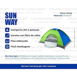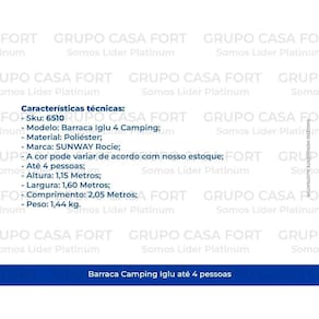 Barracas fáceis de montar, com peso e volume reduzido devido a sua estrutura em varetas de fibra de vidro interligando-as. São confeccionadas em poliéster, com a costura entre o piso e o dormitório invertida, evitando vazamento de água para o interior da barraca. Marca: Não Informado