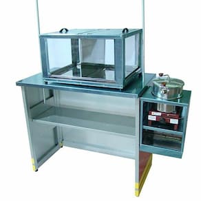 Modelo: 3011 Gabinete em chapa galvanizada e com a pintura a pó Mesa superior em aço inoxidável Tubos de sustentação do toldo e super reforçado. Gabinete totalmente desmontável. Prateleira interna para utensílios. Fácil de montar e desmontar. Ocupa pouco espaço no transporte. Placa com descrição sobre o toldo