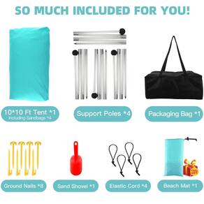 Perfeita para longos dias de praia, acampamentos, piqueniques em parques e diversão no quintal, a barraca pop-up protege qualquer solo macio e arenoso e se instala em minutos. Como manter o dossel elevado e estável em ventos fortes? 1. utilizado na praia arenosa. Encha os 4 sacos de areia com o máximo de areia que puder, certificando-se de que a barraca esteja apertada, separe os 4 sacos de areia para obter o equilíbrio certo. Faça um buraco na areia e depois enterre os sacos de areia. 2. utilizado na grama Encha os sacos de areia com pedra e instale pregos no chão. Como montar a barraca pop-up de praia? 1. Coloque sua barraca. 2. Encha os sacos de areia com areia se você usá-lo na praia. Ou encha os sacos de areia com pedra e coloque-os no lugar com pinos de grama se você estiver usando na grama. (encha os sacos de areia com mais areia para maior ancoragem) 3. Desdobre os bastões, suporte 2-4 sob a barraca (dependendo do tamanho do grupo) e amarre a bola. 4. Insira os 4 postes na areia um por um. Ajuste a posição dos sacos de areia e endireite os postes para o estado mais estável. (Evite inclinar os postes na areia, pois pode torná-la menos estável) 5. Cave um buraco fundo e enterre o saco de areia na areia. 6. Coloque o tapete de praia e prenda-o com pregos no chão 7. Aproveite a sombra. O produto inclui: 1 barraca de praia grande de 3 x 3 m. 1 x 1 cobertor de praia 1 bolsa de transporte preta. 4 postes de alumínio de 2 metros. 8 estacas de solo. 4 cordas elásticas. 1 pá de areia. 1 manual do usuário (idioma português não garantido). Não use este toldo de sol de praia em inclinações íngremes. Não use esta barraca pop-up de praia na chuva, tempestade e tempestades com raios. Mantenha todas as chamas e fontes de calor longe deste tecido de para-sol de praia. - Barraca grande de praia pop-up: nosso abrigo solar para barraca de praia tem 3 × 3 m, com 4 postes de alumínio de até 2 metros de altura, aumentando assim a área sombreada em 50%. Os mastros são ajustáveis, você pode projetar um dossel de praia de 2 polos ou um dossel de praia de 4 polos. Este abrigo de praia pode acomodar de 6 a 8 pessoas. O design espaçoso oferece uma sombra refrescante, perfeita para amigos, familiares e bons momentos - Desempenho superior: o tecido de lycra espesso exibe desempenho de proteção ultravioleta FPS 50 +, que pode bloquear efetivamente a radiação solar, reduzir queimaduras solares e filtrar 98% da radiação ultravioleta prejudicial, para cuidar totalmente do corpo humano. Além disso, a extremidade do poste de alumínio tem um design cônico e o tubo de alumínio é engrossado de 16 mm a 20 mm. O dossel de sombra de praia manterá você protegido em dias ensolarados e chuvosos - NOVOS ACESSÓRIOS INCLUÍDOS: Nosso conjunto de persianas de praia atualizado adiciona um cobertor de praia à prova d'água extra de 2 × 18 m e 4 pequenos pinos de tapete. O pacote autêntico contém dossel de praia de 3,5 x 3 m, 1 pacote de bolsa de transporte, 4 postes de alumínio, 4 pacotes de pinos de terra, 4 pacotes de corda elástica, 1 pacote de pá de areia, 1 pacote de manual do usuário (sem garantia de versão em português). Basta trazer nosso conjunto de barraca e você pode ir à praia para experimentar momentos maravilhosos sem comprar equipamentos extras - Configuração fácil: em apenas alguns minutos, espalhe-a, encha os sacos de areia, monte e coloque os postes na vertical, prenda o tecido na bola de EVA com cordas elásticas e puxe firmemente, você receberá uma grande barraca de guarda-sol. Seu design inteligente e estrutura simples facilitam o manuseio em vários ambientes externos - Multiuso e portátil: para viagens em família à praia, festas de fim de semana ou piqueniques de acampamento de verão. Esta barraca portátil para a praia pode se tornar sua companheira preferida ao ir à praia, acampamento, parque, festa de piquenique, pesca no quintal