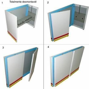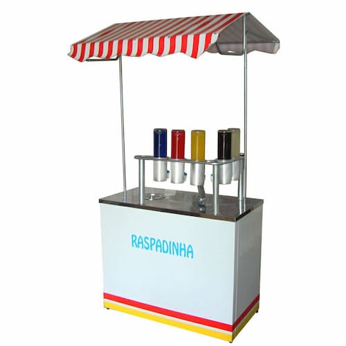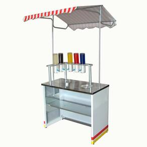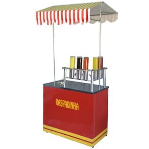 Gabinete em chapa galvanizada e com adesivo. Mesa superior em aço inoxidável Tubos de sustentação do toldo e super reforçado. Gabinete totalmente desmontável. Prateleira interna para utensílios. Fácil de montar e desmontar. Ocupa pouco espaço no transporte.