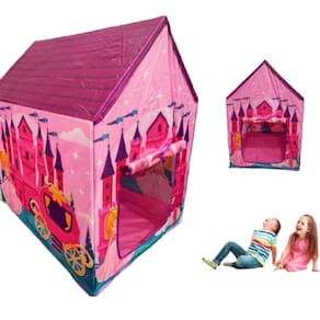 Marcas: POP Brinquedos Modelo: TOY23003 Barraca Castelo das Princesas Montagem necessária: Sim Cor: Rosa Tipo s de material: Plástico, Poliéster, Fibras Têxteis Itens Inclusos: Suportes plásticos para estrutura + sacola para armazenagem Idade recomendada: 3 anos e acima Forma: Castelo