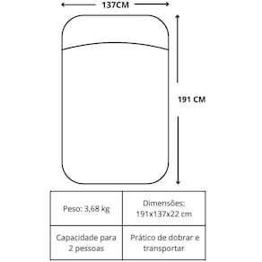 Características TécnicasEsse conjunto atende tanto a famílias grandes quanto a casais que desejam conforto em suas viagens. O público-alvo inclui amantes de camping, aventureiros, grupos de amigos e também pessoas que buscam soluções práticas para receber visitas em casa. Um dos diferenciais está na combinação entre barraca espaçosa e colchão confortável, criando um kit completo para acampamentos. Além disso, ambos os produtos são da marca KALA, reconhecida por oferecer qualidade e durabilidade em equipamentos de lazer e camping. Como curiosidade, a barraca foi projetada para suportar diferentes condições climáticas, enquanto o colchão, mesmo sendo inflável, consegue oferecer suporte semelhante ao de uma cama tradicional, garantindo maior conforto durante o uso. Com essa dupla, você terá mais tranquilidade, organização e conforto, seja em aventuras ao ar livre ou em situações cotidianas. Aproveite toda a praticidade, resistência e conforto que apenas a combinação da Barraca Canyon 7 Pessoas com o Colchão de Casal Inflável Azul KALA pode proporcionar. Torne suas experiências ainda mais inesquecíveis com equipamentos que garantem segurança e qualidade.