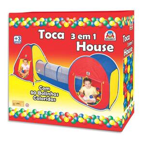 Barraca Toca Infantil com Tunel 3 Em 1 C/80 Bolinhas - BraskitSão duas tocas e um túnel para a criança passar de uma para outra.A Toca é o brinquedo ideal para fazer a alegria da garotada, a toda hora.Ótima para brinquedotecas, quartos de brinquedo, garagem, festas infantis, etc.Fácil de limpar, você precisa limpar suavemente a sujeira com um pano úmido e é feito de material de poliéster retardador de fogo para segurança.O presente perfeito para todas as crianças Uma barraca de playground multicolor cria um reino para uso interno e externoDiversão no quintal ou no quarto, é muito fácil e rápido de configurar.Convenientemente inclui uma mala de transporte que facilita o transporte.Idade acima de 4 anosTamanho da embalagem 48 x 48x 17 cmTamanho toca triangular 88 x84 x84 cm Toca quadrada 88 x 73 x 72 cm Tunel 108 x 46 cmCONTÉM: - 2 toca 1 tunel e 80 bolinhaSFabricante Braskit