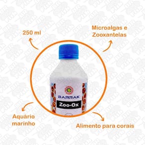 Zo-ox Microalgas e Zooxantelas 250 ml De conhecimento dos Aquaristas a suma importância da alimentação dos corais, por meio da fotossíntese na obtenção de energia por autotrofia, baseada sob o mecanismo resultado da benéfica relação simbiótica entre os corais e as microalgas zooxantelas. Além das outras formas de obtenção de energia por meio da osmotrofia e heterotrofia, onde há captação ou absorção do alimento pelos pólipos ou no tecido. A Linha Barrak se dedica a formar a plenitude de um habitat em aquários o mais idêntico possível aos encontrados nos recifes naturais, para fornecer capacidade total aos seres vivos mantidos, todas as ferramentas necessárias para os processos naturais da sua vida, crescimento e reprodução. Avançamos ainda mais para fornecer Alimento para corais a base de um blend de microalgas que constituem o Fitoplâncton e presença de Zooxantelas, isso mesmo, as microalgas que participam ativamente no tecido dos corais para a obtenção de energia pela fotossíntese. Marca: Não Informado