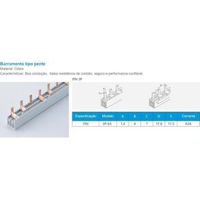 Voltagem: 110v/220v Barramento tipo pente tripolar modelo 3p 63a Produto: barramento tipo pente Modelo: 3p tripolar Corrente nominal: 63a Número de polos: 3 trifásico Tipo de conexão: pente Tensão suportada: até 690v ac Material condutor: cobre Isolamento: pvc rígido antichama Seção do condutor: aproximadamente 10 mm Compatibilidade: disjuntores padrão din tripolar e bipolar Norma técnica: iec/en 60947-7-1 Comprimento padrão: 1 metro Aplicação: distribuição de energia em quadros elétricos Capacidade de interligação: até 57 módulos por barramento Cor: branco Tipo de encaixe: pino reto Baixa resistência a condutividade Alta condutividade Todas as dúvidas podem ser auxiliadas pós-venda. Temos técnico disponível para auxiliar e ajudar com dúvidas técnicas ou de instalações. : 90 dias. As imagens do anúncio são meramente ilustrativas. Podendo haver variações de cor e tamanho do produto anunciado, a depender da disponibilidade em . Marca: Não Informado Ean: 7793434335000