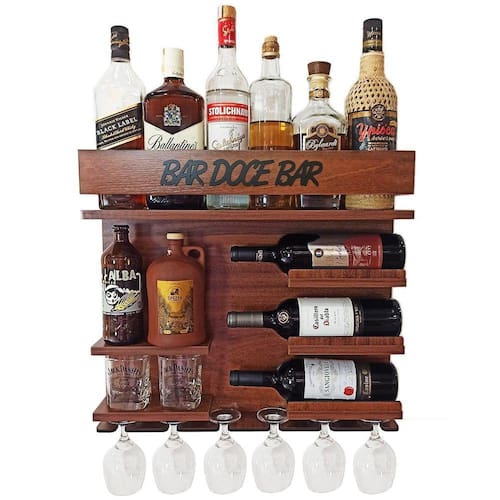 Barzinho Adega Parede - Bar Doce Bar - 54 x 51 Imbuia Suas bebidas agora bem mais visíveis e organizadas com o nosso BARZINHO de PAREDE. Peça em MDF Bilaminado que torna a peça Especial, pois seus veios imitam muito bem a Madeira Natural. E pra completar, ocupando pouquíssimo espaço em seu ambiente, você consegue organizar suas bebidas e taças. Capacidade Aproximada para 6 Garrafas + 4 Copos ou garrafas pequenas + 6 Taças + 3 Garrafas de Vinho MDF com espessura de 15mm, o que torna a peça bem firme e visualmente muito Bonita. Além de decorar muito bem qualquer ambiente, ele também pode ser um ÓTIMO PRESENTE. Principais Características: Feito 100% em Mdf 15mm Bilaminado Capacidade Aproximada para 6 Garrafas + 4 Copos + 6 Taças + 3 Garrafas de Vinho Dimensões: 54cm de largura x 51cm de altura x 13cm de profundidade Acompanha parafusos e buchas para fixação. Indicações de Uso: Pubs Home Bar Varandas e Sacadas com temática Gourmet Cozinhas Salas em Geral Churrasqueiras Obs: Imagem Meramente Ilustrativa, Copos, Garrafas e Demais Acessórios Não Acompanham o Produto