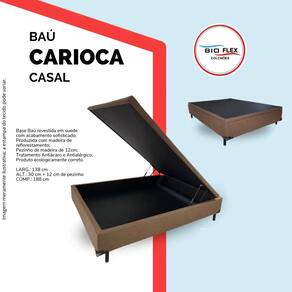 Base Box Baú Carioca Casal Tecido Suede 30x138x188 Bio Flex A Base Box Baú Carioca Casal Tecido Suede 30x138x188 Bio Flex combina funcionalidade e elegância para o seu quarto. Mantendo as dimensões ideais para colchões de casal padrão. Esta base box se destaca pelo revestimento em tecido suede. Este material confere um toque suave e sofisticado ao produto, elevando a estética do ambiente. Além do conforto e do design atraente, esta base box oferece um amplo espaço interno graças ao seu sistema de baú. Perfeito para armazenar roupas de cama, travesseiros, cobertores e outros objetos, o baú ajuda a manter o quarto organizado e livre de desordem. A estrutura robusta da Bio Flex garante a durabilidade e a resistência necessárias para o uso diário, fazendo desta base uma escolha prática e charmosa para o seu descanso.\nMedidas\nAltura 30 cm\nLargura 138 cm\nComprimento 188 cm\nCaracterísticas\nModelo Base Box Baú Carioca Casal\nTipo do produto Base Box Baú Casal\nFabricante Bio Flex\nRevestimento Suede\nEstrutura Madeira de Reflorestamento\nTratamento Antiácaro e Antialérgico\nTipo de Pistão A gás\nQuantidade de Pés 05\nGarantia 3 meses\nInformações Importantes\nObjetos decorativos que porventura apareçam na foto, não acompanham o produto. Não nos responsabilizamos pela montagem/instalação dos produtos.\nMontagens, desmontagens e instalações são responsabilidades do cliente. Indicamos que contrate uma empresa de montagem ou um montador de sua confiança.\nAlém disso, favor verificar se os pés e acessórios estão dentro do forro inferior do produto. Em suma, todas as informações divulgadas sobre o produto são de responsabilidade do Fabricante.\nAs cores do produto podem variar de acordo com o seu monitor, a iluminação do ambiente em que você está e até mesmo a sua percepção visual. Além da cor, pequenos detalhes e acabamentos podem não ficar evidentes na foto, por isso as imagens são meramente ilustrativas.
