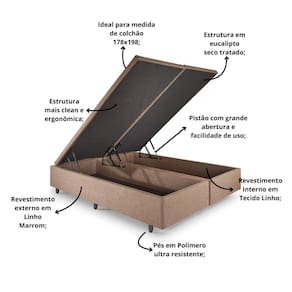 Bem-Vindos à Cama InHouse! Baú King Californiano 178 : tudo para o seu conforto! O manuseio do baú é bastante simples, não tem desculpa para não organizar, com pistões, fica ainda mais fácil, afinal, a ergonomia do baú consegue proporcionar leveza ao processo, seu design é desenvolvido para não haver qualquer dano ao produto, mesmo com utilização frequente do baú. Com revestimento em Linho Marrom, a higienização é facilitada e seu acabamento protege o baú de qualquer deformidade por impacto externo. Conheça as 6 principais vantagens do Baú King Californiano:1 - Saúde e bem-estar Tratamento antialérgico e antiácaro; Gel Sílica para prevenir concentração de umidade e de mofo na área interna do baú.2 - Design e Durabilidade Laterais e tampa com revestimento em Linho MarromO que além de lindo é de fácil higienização; O tamanho da tampa do baú é estendido em 4 cm, o que proporciona mais beleza ao design e permite o manuseio do baú com mais facilidade, sem a necessidade de puxadores plásticos que ressecam e quebram em pouco tempo de uso, seu acabamento é fino, com tampa revestida e cantos arredondados.3 - Estrutura reforçada As laterais e a cabeceira do produto são montadas com madeiras na vertical e transversal e as quinas com mão francesa, o que ajuda a travar e dar mais resistência; O fundo do baú é separado e parafusado por baixo, aumentando assim a resistência e garantindo um acabamento perfeito; O baú conta com seis pés de polímero;4 - Facilidade A tampa estendida e reforçada, aliada aos pistões a gás, garantem facilidade no manuseio e durabilidade.5 - Compromisso com o meio ambiente O Baú King conta com Madeira de eucalipto tratada, proveniente de reflorestamento, com padrão de qualidade de exportação; A embalagem é confeccionada com materiais 100% reciclados e a empresa conta com logística reversa.6 - Nada de preocupação: O produto é 100% embalado com papelão e plástico, o que garante a integridade do produto, após todo o processo logístico. Na mesma data da compra, nossa equipe enviará um link com vídeo explicativo onde mostramos passo a passo a montagem do seu produto.Medidas e características estruturais Medida Externa: 178x198x34cm - sem os pés 178x198x42cm - com os pés Medida Interna: 158x188x24cmCaracterísticas estruturais:Tecido em Linho Marrom: TNT de alta gramatura; Costura reta; Acabamento impecável: sem parafusos a mostra no fundo do baú que é parafusado por baixo. Pés em Polímero;Cuidados e higienização: O produto é de fácil higienização, pois conta com tratamento impermeabilizante, assim, apenas um pano umedecido com água é suficiente.*Não é indicado o uso de produtos químicos.Itens que serão entregues: - 2 Cama Baú 89x198 - 1 Caixa de Pezinhos - 1 Arco de apoio que será fixado na parte de trás do baú para colchão não escorregar.INFORMAÇÕES IMPORTANTES: - Confira as dimensões do produto e certifique-se de que estão adequadas aos elevadores, portas e corredores do local da entrega, pois não fazemos a montagem e desmontagem do produto e/ou portas e janelas, nem içamento pelo lado de fora do prédio ou da residência. - A transportadora não realiza a montagem do produto, não sobe escadas, apenas elevadores, caso não suba por elevador, a responsabilidade de subir o produto é do cliente. - NÃO ACOMPANHA O COLCHÃO - Foto meramente ilustrativa.Dicas para a montagem facilitada:Ao receber o produto, posicione na vertical retirando a embalagem plástica e o papelão.Os pés da sua cama, estão dentro do seu baú, será necessário deitar seu produto e retirar a fita e puxar com cuidado os pés que estão grampeados na tampa. Após retirar os pés, volte a fita pro mesmo lugar e posicione novamente na posição vertical, e comece a rosquear os pés.Para peças bipartidas, será necessário colocar a chapa de união junto aos pés.Após, coloque seu baú na posição horizontal e retire a fita.Atenção:Será necessário para abertura do mesmo, que o colchão se encontre em cima do produto, assim evitará que o mesmo abra bruscamente ou impossibilite o fechamento do seu baú.Não é recomendado abrir e fechar o baú sem o colchão sobre o mesmo, pois isso acarretara no mau funcionamento do produto.
