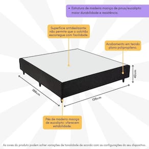 Base Box Casal 138x188cm Rústico Alpha Inducol Cr35246c Grafite Grafite A Base Box Casal 138x188cm Rústico Alpha Inducol CR35246C é a combinação perfeita de elegância e conforto. Feita com madeira de pinus e eucalipto, esta base oferece uma durabilidade incomparável. Seu acabamento em tecido plano polipropileno proporciona um toque agradável e sofisticado, enquanto a superfície antideslizante não permite que o colchão escorregue com facilidade. Além disso, conta com pés de madeira de eucalipto, que garantem estabilidade, praticidade na higienização do ambiente, e seu design clean se adapta a qualquer ambiente. Conteúdo da Embalagem: 1 (uma) Base Box Certificado de Garantia