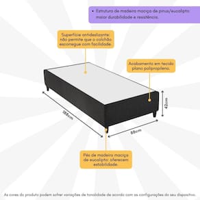 A Base Box Solteiro 88x188cm Rústico Alpha Inducol CR35246A é a combinação perfeita de elegância e conforto. Feita com madeira de pinus e eucalipto, esta base oferece uma durabilidade incomparável. Seu acabamento em tecido plano polipropileno proporciona um toque agradável e sofisticado, enquanto a superfície antideslizante não permite que o colchão escorregue com facilidade. Além disso, conta com pés de madeira de eucalipto, que garantem estabilidade, praticidade na higienização do ambiente, e seu design clean se adapta a qualquer ambiente.
