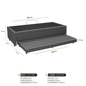 Com este produto, você otimiza o espaço do seu quarto de forma inteligente e funcional. O sistema de abertura prática com puxador em PVC permite levantar o box com facilidade, proporcionando acesso rápido ao compartimento interno. Além disso, o modelo conta com uma cama auxiliar embutida, com 17 cm de altura, suporta até 100 kg por pessoa, com estrutura de espuma D28 ortopédica de 5 cm, perfeita para acomodar visitas ou ampliar o espaço de descanso sempre que necessário. Uma peça coringa que alia confo Acompanha Cama Auxiliar: Sim Ambiente Principal: Quarto Bicama: Sim Cantoneiras: Não codigo_ean: 7900288189745 Cor: Cinza Cor do Produto: Cinza Itens Inclusos: 1 Base Box, Kit Ferragens e Manual de Montagem Linha ou Coleção: Imperatriz Manual de Especificação Técnica: https://product-hub-prd.madeiramadeira.com.br/448815963/documents/e9c792d2-cdcc-4e70-8c01-93e5d6cf39903056577649717519858098684.pdf Manual de Montagem e Instalação: https://product-hub-prd.madeiramadeira.com.br/448815963/documents/ec992365-2835-452a-a174-798226f0035c3056561649717519857656397.pdf Marca: RBF Material da Estrutura: Eucalipto Reflorestado Material dos Pés: PVC Necessita Montagem: Sim Origem do Produto: Nacional Peso: 44.7 Possui Baú: Sim Recomendações de Uso, Manutenção e Limpeza: Aspirar produto para eliminar poeira, utilizar um pano levemente umedecido com água e sabão neutro, seguido de pano seco.Não limpar com escovas ou produtos abrasivos Revestimento da Base Box: Poliéster Tamanho da Cama Auxiliar: 17x168x75 Tamanho do Produto: Solteiro Marca: Não Informado