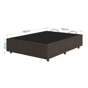 DIMENSÕES DA CAMA BOX BAÚ Altura total: 40 cm; Comprimento total: 188 cm; Largura total: 138 cm; Altura Interna: 28 cm; Altura dos pés: 6 cm; Suporta até 120 Kgs por pessoa Peso: 28kg.