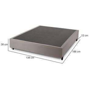 Estrutura: Madeira 100% eucalipto de reflorestamento de 20 mm de espessuraRevestimento: Em tecido Jacquard e espuma Cantoneiras: Sim, para proteção para preservação da base Ideal: Para colchão de casal na medida de 138 cm de largura Pés: Sim, em PVC que contribui com a estabilidade e com a capacidade para suportar até 150 kg, pés com altura de 12 cm.Dimensões do produto montado