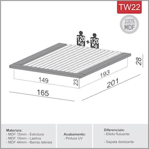 Características: Estrutura 100% MDF Acabamento em Pintura UV Sapatas Plásticas e Deslizantes Efeito Flutuante Estrados com Acabamento em Massa Bordas Arredondadas Ideal para Colchão de Casal (138cm) e Queen (158cm) NÃO ACOMPANHA COLCHÃO
