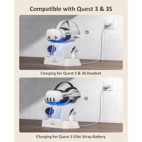 PortátilEspecificações: Entrada USB-C: 5V/4A Saída USB-A: 5V / 400mA Saída USB-A para fone de ouvido de carregamento: = 2000mA Saída da porta de carregamento do controlador: = 800mA x 2 Capacidade da bateria recarregável: 1850 mAh x 2 - ?Projetado para o jogador Elite?A base de carregamento NexiGo é projetada especificamente para carregar os fones de ouvido Quest 3 e 3S, controles e alça Elite com bateria. Com carregamento sem fio, é incrivelmente fácil carregar todos os seus dispositivos ao mesmo tempo para sessões de jogos ininterruptas. - Carregamento rápido: usando o adaptador de energia USB-C autêntico Quest 3 ou 3S 18W, o fone de ouvido VR pode ser totalmente carregado em apenas 4,4 horas e os controles atingem a capacidade total da bateria em apenas 3 horas. Diga adeus aos longos tempos de espera e desfrute de sessões de jogos ininterruptas com nossa solução de carregamento rápido. Carregue seu controle sem esforço sem remover a capa de silicone com os slots de carregamento fáceis de usar. - ?Indicadores LED convenientes?Projetado com indicadores de carregamento LED na coluna de suporte e nos lados esquerdo e direito da base para indicar o status de carregamento do fone de ouvido e controles acoplados. É fácil dizer quando seus acessórios estão carregados: laranja durante o carregamento e azul quando totalmente alimentado. - ?Proteção de carregamento?Esta base de carregamento oferece proteção abrangente para o seu controle e fone de ouvido durante o processo de carregamento. Inclui recursos de proteção contra sobrecarga, sobrecarga e sobrecorrente para garantir um carregamento seguro e confiável sem qualquer risco de danos ou mau funcionamento. Fique tranquilo sabendo que seus dispositivos estão protegidos durante o carregamento. - ?Economize tempo e dinheiro?Este pacote inclui baterias recarregáveis e capas de controle, eliminando a necessidade de substituição frequente de bateria. Aproveite a conveniência das baterias recarregáveis e economize tempo e dinheiro. O suporte armazena seu fone de ouvido Quest 3 ou 3S, alça Elite com bateria e controles de toque em um só lugar, mantendo sua área de jogo organizada.