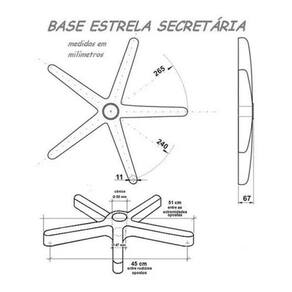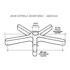 Base Estrela para Cadeira Giratória Secretária e Executiva com Rodizio Base Estrela para Cadeira Giratória Secretária e Executiva com RodizioUso indicado para cadeiras em geral, fácil instalação, instalação através de encaixe Ficha Técnica: 01 Estrutura Base em aço recoberta com capa em peça única injetada em polipropileno. Base giratória, com patas em aço carbono, tubular, de secçao semi oblonga com dimensões mínimas de 20x39x120mm com reforço de solta mig e raio de 280mm Permite junção de rodízios ou sapatas plásticas deslizantes por meio de ponteiras com encaixe de 11mm.Capacidade:Peso Recomendado : Usuário de até 120 Kg Cores Disponíveis: Preto Padrão de envio: Preto Secretária diametro Total: 570mm Medidas da embalagem: 15cm x 50cm x 50cmPeso: 2,0 Kg Conteúdo da Embalagem 01 base para cadeira + 5 Rodizio Marca: Conceito Cadeiras