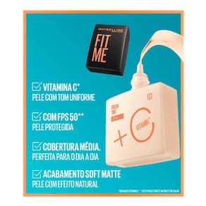 Maybelline NY apresenta a nova base Fit Me Fresh Tint com vitamina C, FPS 50 e acabamento glow natural para o dia a dia. Essa base inovadora combina o benefício da vitamina C, que é conhecida por sua ação antioxidante que ajuda na renovação da pele, e proteção solar FPS 50. Além disso, sua fórmula exclusiva oferece glow e viço natural, proporcionando uma cobertura uniforme, sem pesar no rosto. A base Fit Me Fresh Tint é indicada para todos os tipos de pele e é indicada para quem deseja um aspecto mais natural no dia a dia, além de manter a pele protegida contra os danos causados pelo sol. Experimente agora mesmo a nova base Fit Me Fresh Tint de Maybelline NY com Vitamina C, FPS 50 e acabamento leve e natural e descubra o segredo para uma pele radiante, saudável e iluminada. Com FPS 50 e vitamina C, ativo conhecido por ação antioxidante que ajuda na renovação da pele, reduzindo as marcas do rosto.