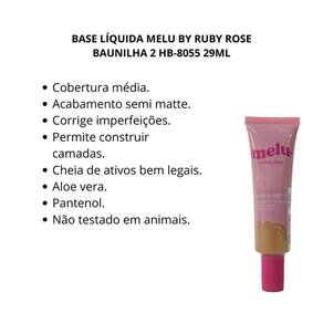 A Base Líquida Melu é a escolha perfeita para dar um up na sua make do dia a diaCom uma cobertura média e acabamento semi matte, da para corrigir as imperfeições e ainda assim ter uma pele bem incrível.Além de construir camadas, a base também é cheia de ativos bem legais, que vão dar aquela ajuda mara para a sua pele.