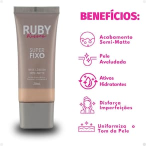 A Base Líquida Super Fixo da Ruby Kisses é sinônimo de pele bem preparada e com aspecto natural. Com toque seco e acabamento semi-matte, ela proporciona um aspecto aveludado para a pele. Sua nova fórmula contém Ácido Hialurônico, Pantenol e Vitamina E, que possuem ação antioxidante e hidratante. Possui fórmula de média cobertura, que permite a construção de camadas, e performance de longa duração .