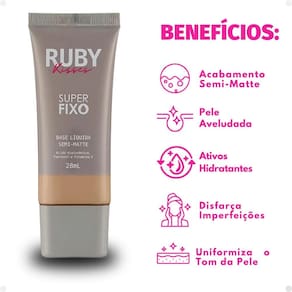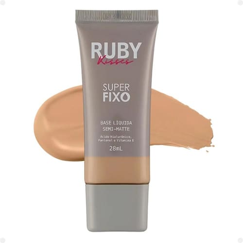 A Base Líquida Super Fixo da Ruby Kisses é sinônimo de pele bem preparada e com aspecto natural. Com toque seco e acabamento semi-matte, ela proporciona um aspecto aveludado para a pele. Sua nova fórmula contém Ácido Hialurônico, Pantenol e Vitamina E, que possuem ação antioxidante e hidratante. Possui fórmula de média cobertura, que permite a construção de camadas, e performance de longa duração .