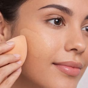 - 2. Aplique uma pequena quantidade de base no rosto, utilizando um pincel, esponja ou as pontas dos dedos.