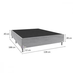 Características: - Altura do box sem pés: 28 cm - Material da estrutura: Madeira em Pinus 4 mm - Colchão : 128x188 cm -viúva - não incluso- - Tecido: Sued - Modelo do Box: Vazado - Não possui anti-derrapante - Não possui tratamento anti-cupim - 07 pés fixos de 12 cm -kit pés estará armazenado dentro do TNT- - Suporte de peso: 120 kg cada lado - Tempo de garantia: 3 meses