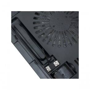 Outro destaque é o ventilador embutido de 120mm, que oferece excelente desempenho com velocidade ajustável entre 750 e 1500 RPM. Além de ser eficaz no resfriamento, o ventilador opera com baixa emissão de ruídos, garantindo um ambiente tranquilo para trabalho ou lazer. A iluminação em LED adiciona um toque de sofisticação e estilo ao produto. Com conexão USB macho/fêmea, a base é compatível com notebooks de até 15 polegadas, tornando-se uma opção prática e universal para diferentes modelos.