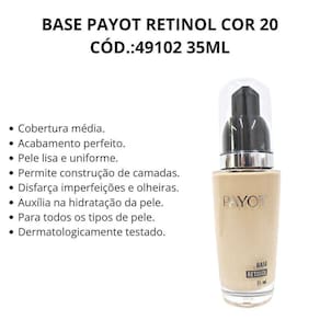 A Base Retinol é maquiagem e tratamento cosmético em um só produto. Proporciona acabamento perfeito, pele lisa e uniforme. Fórmula de média cobertura, que permite a construção de camadas, disfarça poros, imperfeições e olheiras. Uniformiza o tom da pele com acabamento natural. Sua fórmula com Retinol Vegetal Ajuda a prevenir o envelhecimento precoce e devolve o viço da pele. Contribui na redução da aparência de rugas, linhas de expressão e auxilia na hidratação. Para todos os tipos de pele.