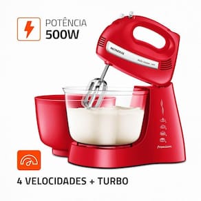 Para o sucesso de suas receitas, nada melhor do que aparelhos que facilitam sua vida na cozinha e no preparo rápido e prático de suas refeições. A Batedeira Mondial Premium Bella Massa Inox Red B-29 NP vem com 4 velocidades mais a Função Turbo, para você fazer vários tipos de receitas sem dificuldade com seus 500W de potência, deixando os ingredientes facilmente misturados.