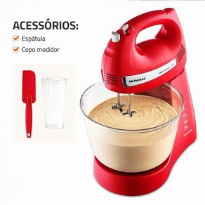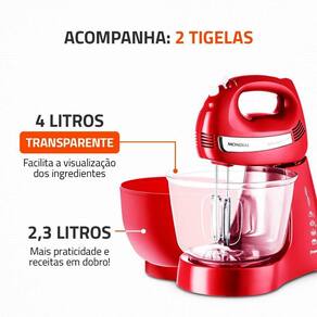 Bonita, com design moderno e na cor vermelha, deixará sua cozinha mais elegante e equipada. Seus batedores são resistentes e de aço cromado. Versátil, vem com duas tigelas com capacidade para 4 ou 2,3 litros uma delas é transparente, possibilitando a visualização da receita durante o preparo, além da praticidade de poder fazer diferentes etapas de suas receita ao mesmo tempo, usando recipientes diferentes.