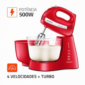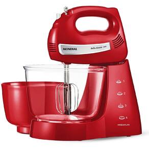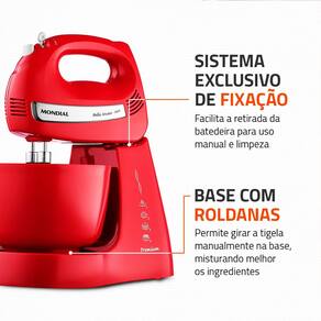 Para o sucesso de suas receitas, nada melhor do que aparelhos que facilitam sua vida na cozinha e no preparo rápido e prático de suas refeições. A Batedeira Mondial Premium Bella Massa Inox Red B-29 NP vem com 4 velocidades mais a Função Turbo, para você fazer vários tipos de receitas sem dificuldade com seus 500W de potência, deixando os ingredientes facilmente misturados.Bonita, com design moderno e na cor vermelha, deixará sua cozinha mais elegante e equipada. Seus batedores são resistentes e de aço cromado. Versátil, vem com duas tigelas com capacidade para 4 ou 2,3 litros uma delas é transparente, possibilitando a visualização da receita durante o preparo, além da praticidade de poder fazer diferentes etapas de suas receita ao mesmo tempo, usando recipientes diferentes.Fácil de manusear, a base possui roldanas que permitem que o aparelho fique firme em superfícies, proporcionando mais segurança. Para facilitar suas receitas, acompanha copo medidor e espátula para acertar na medida e quantidade de ingredientes.A Mondial equipa e deixa sua cozinha ainda mais charmosa!