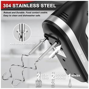 5 acessórios de aço inoxidável Fácil de limpar e laváveis. 2 × Ganchos de massa para bater massa, 2 × Batedeiras 1 × Batedor de ovos e cremes, sem ferrugem e queda aparecerá após um longo tempo de uso.