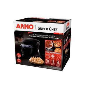 Tenha praticidade, beleza e eficiencia para seu dia a dia. Com a Batedeira Arno Planetaria Super Chef, fazer suas receitas ficara muito mais facil e prazeroso. Com alta potencia de 750W e 15 velocidades, voce vai preparar suas massas com um perfeito resultado e de maneira muito mais rapida! Alta capacidade da tigela: Sua Tigela conta com 5 litros de capacidade para voce preparar ate o dobro de uma receita, alem de possuir uma resistencia termica, podendo ser levada para o freezer ou micro-ondas. Batedores para diversos tipos de massas: Completa, ela comporta 3 tipos de batedores, tanto para preparar massas pesadas, quanto medias ou ate leves.
