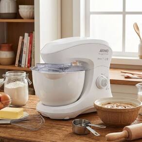 Composição: 1 - Batedeira Planetária Arno Super Chef 750W 1 - Tigela de 5L 1 - Tampa anti-respingo 3 - Batedores (massa pesada, média, leve)