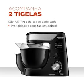 Prepare receitas incríveis com mais praticidade e potência! A Batedeira Planetária Mondial Premium alia desempenho, elegância e versatilidade para transformar seu dia a dia na cozinha. Com 700W de potência, duas tigelas de 4,5L e movimento planetário, ela garante misturas mais homogêneas e volumosas, ideal para massas leves, médias e pesadas.