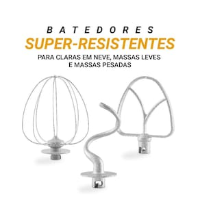 Acompanha três batedores: massa pesada, massa leve e clara em neve, garantindo versatilidade para cada tipo de preparo.