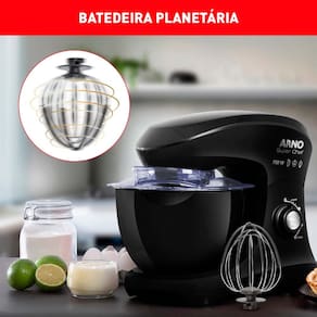Batedeira Planetária Superchef Arno KM01 Preto 220V A melhor planetária já feita pela Arno com alta potência de 750W e 15 velocidades para resultados perfeitos e mais rápidos! Possui 1 tigela de 5L para o preparar até o dobro de uma receita além de ter resistência térmica - pode ser levada diretamente ao freezer ou micro-ondas! Design exclusivo, botão integrado multi velocidades + trava de abertura, tampa anti respingo que além de maior praticidade e menos sujeira, possui o bocal exclusivo com uma maior abertura para facilitar a inclusão de ingredientes. Completa, com 3 batedores - para massas pesadas, médias ou leves além do início supersuave que mistura os ingredientes de forma eficiente evitando respingos + função turbo alcance para claras em neve em até 1 minuto! Além disso, o batedor para massas leves fica mais rente à tigela permitindo bater apenas 1 clara em neve, garantindo um menor desperdício e otimização de receitas menores.