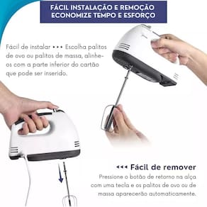 Prepare suas receitas com facilidade e eficiência. Com 7 velocidades ajustáveis e batedores de aço inoxidável, é ideal para bater ovos, misturar massas e muito mais. Seu design ergonômico e leve torna o uso confortável e prático, garantindo resultados perfeitos em suas preparações culinárias.