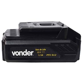 Bateria 12V Litio para Parafusadeira PFV012 Vonder Bateria de íons de lítio, garante alta eficiência de operação. Indicada para a parafusadeira/furadeira PFV 012 VONDER e PFD 012 DWT. Características Técnicas:Tensão V : 12,0 VTipo de bateria: Bateria de íons de lítioCapacidade da bateria A : 1,3 Ah