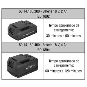 Indicada para a linha de ferramentas a bateria intercambiável DWT. Carregadores indicados: carregador de bateria 18 V ICBD 1805 (6014180500) ou carregador de bateria carga rápida 18 V ICBD 1806 (6014180600).