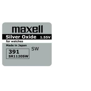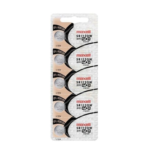Bateria para relógio de pulso Maxell 391 / SR1120W, excelente qualidade e durabilidade Utilizada em relógios Fabricação no Japão Marca Maxell Modelo 391 Tamanho da pilha SR1120W Forma Botão Formato de venda Cartela Unidades por kit 5 Tamanho: Largura 11.6mm, altura 2.05mm Tensão V : 1.55V Corrente A : 55mAh Química: Óxido de Prata É recarregável: Não Embalagem 3 Meses Marca: Não Informado